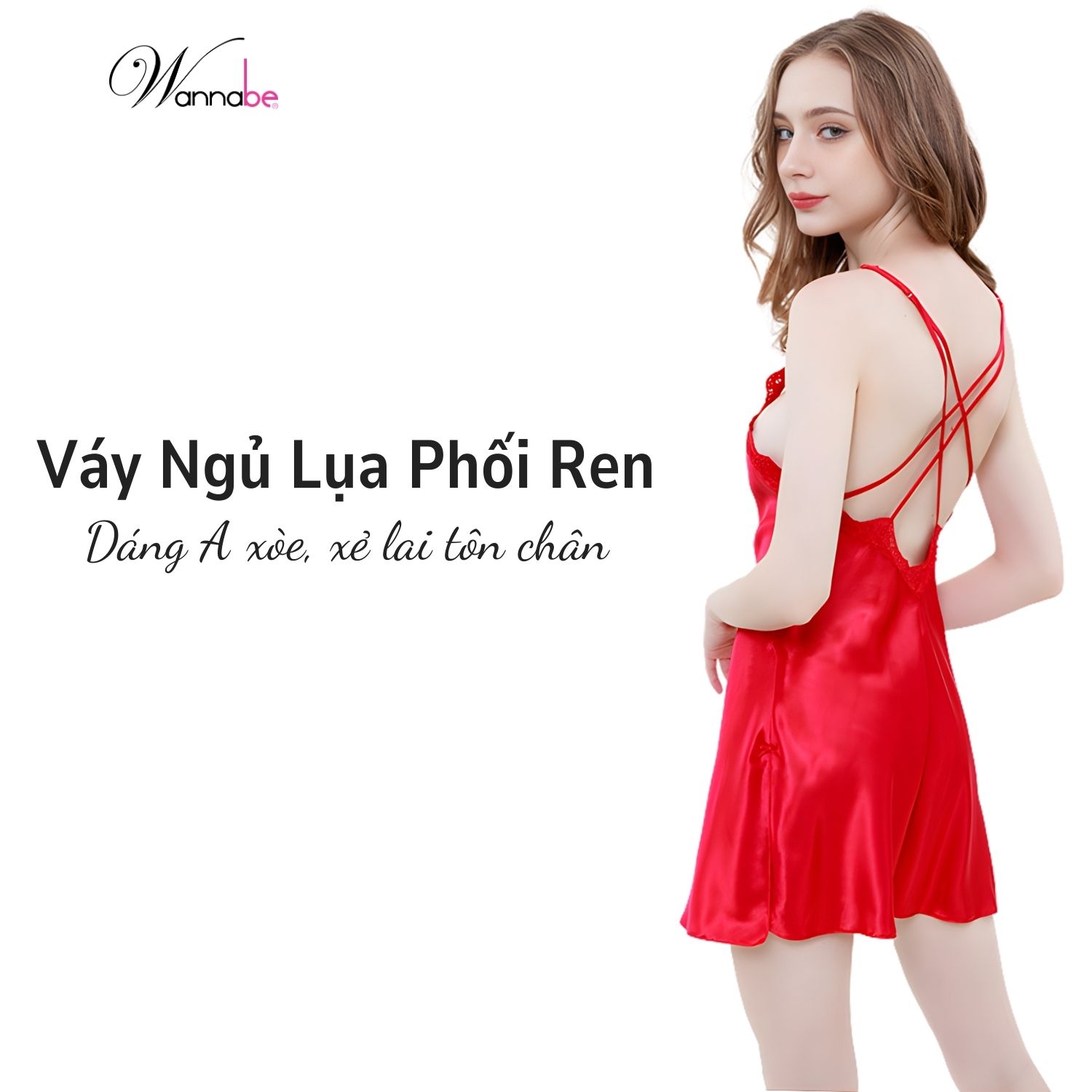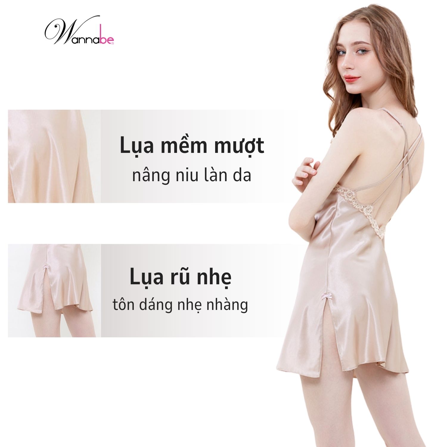 Đầm ngủ WANNABE DNS85 váy ngủ 2 dây lụa cổ tim cut-out lưng sâu viền ren lượn sóng từ trước ra sau khoe vai trần gợi cảm