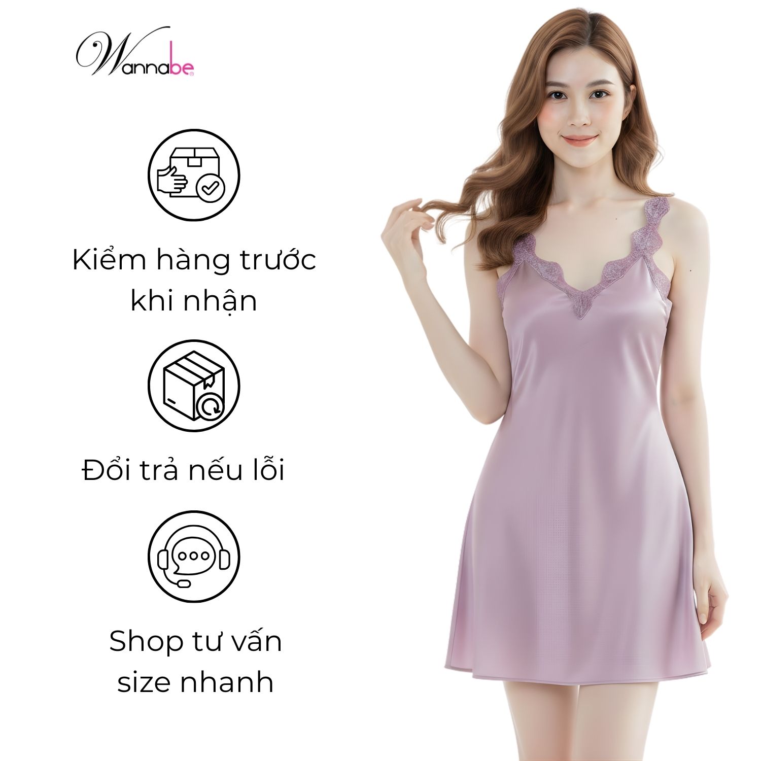 - Đổi đầm ngủ miễn phí nếu lỗi từ WANNABE (các khách hàng vui lòng quay video khi mở hàng để Wannabe hỗ trợ nhanh nhất có thể)