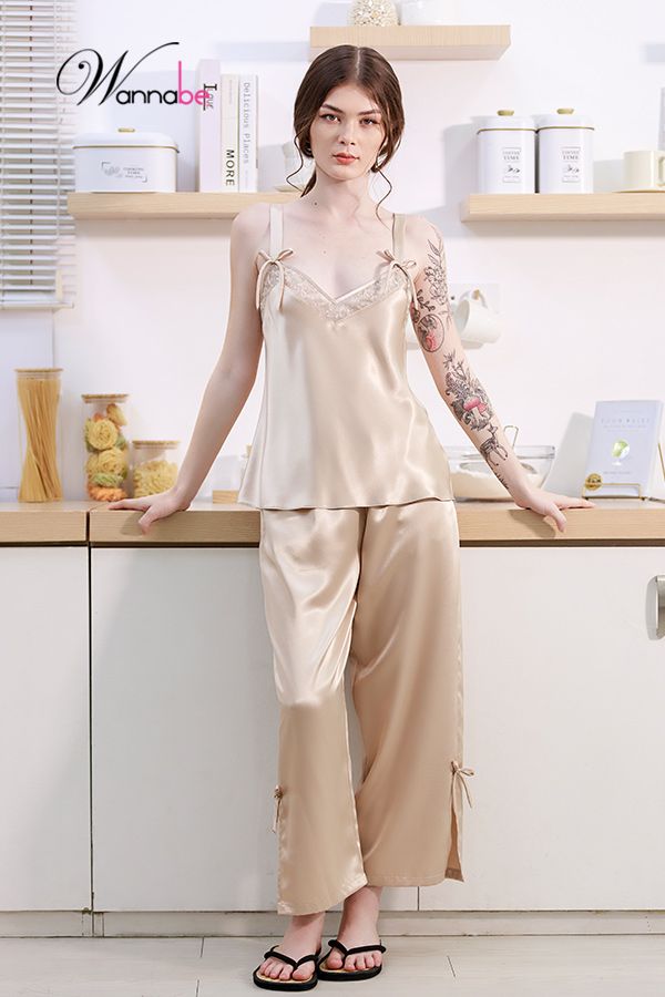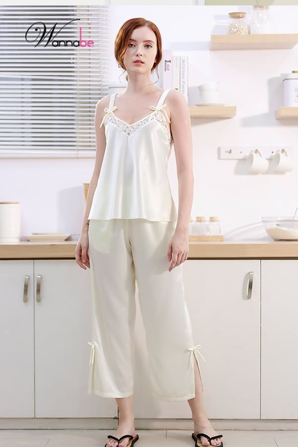 Kiểu dáng: đồ bộ WANNABE gồm áo hai dây, quần dài xẻ đính nơ 2 bên xinh xắn
