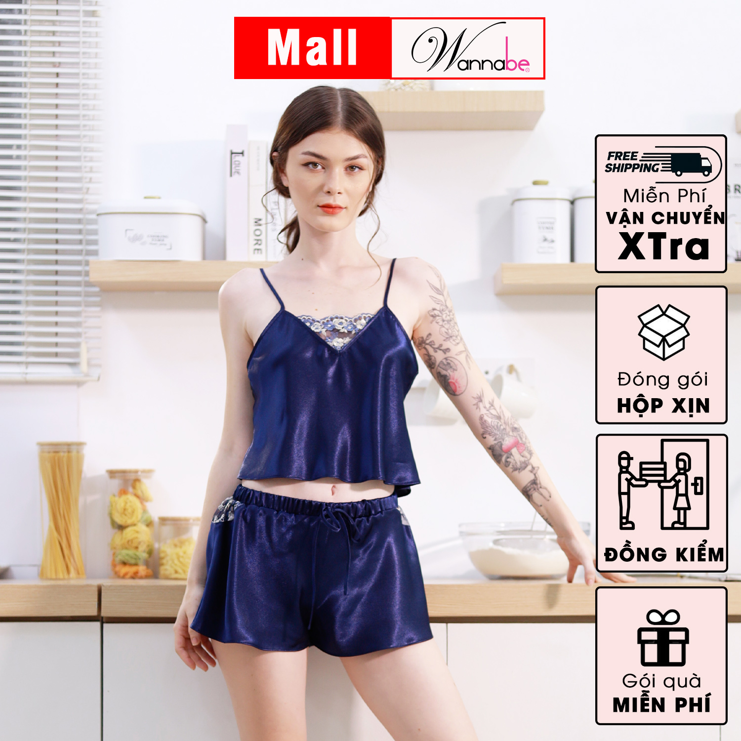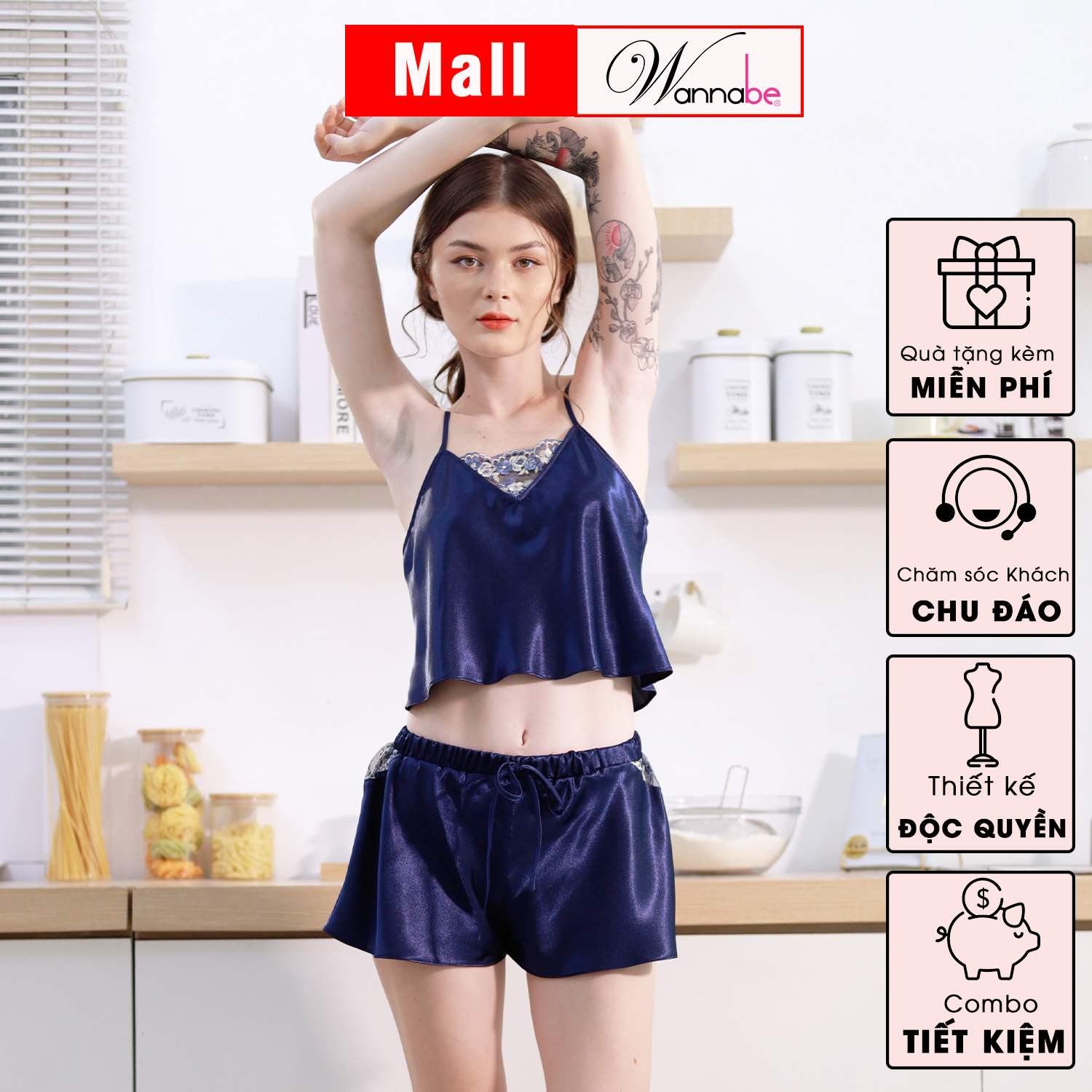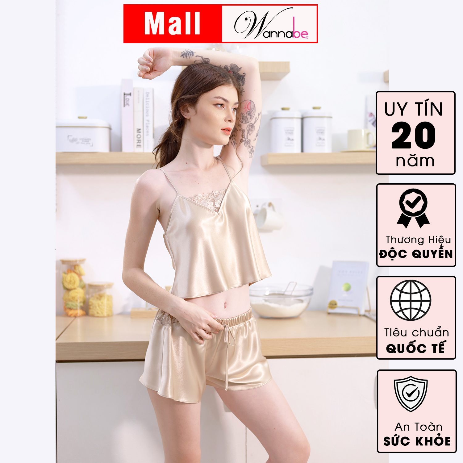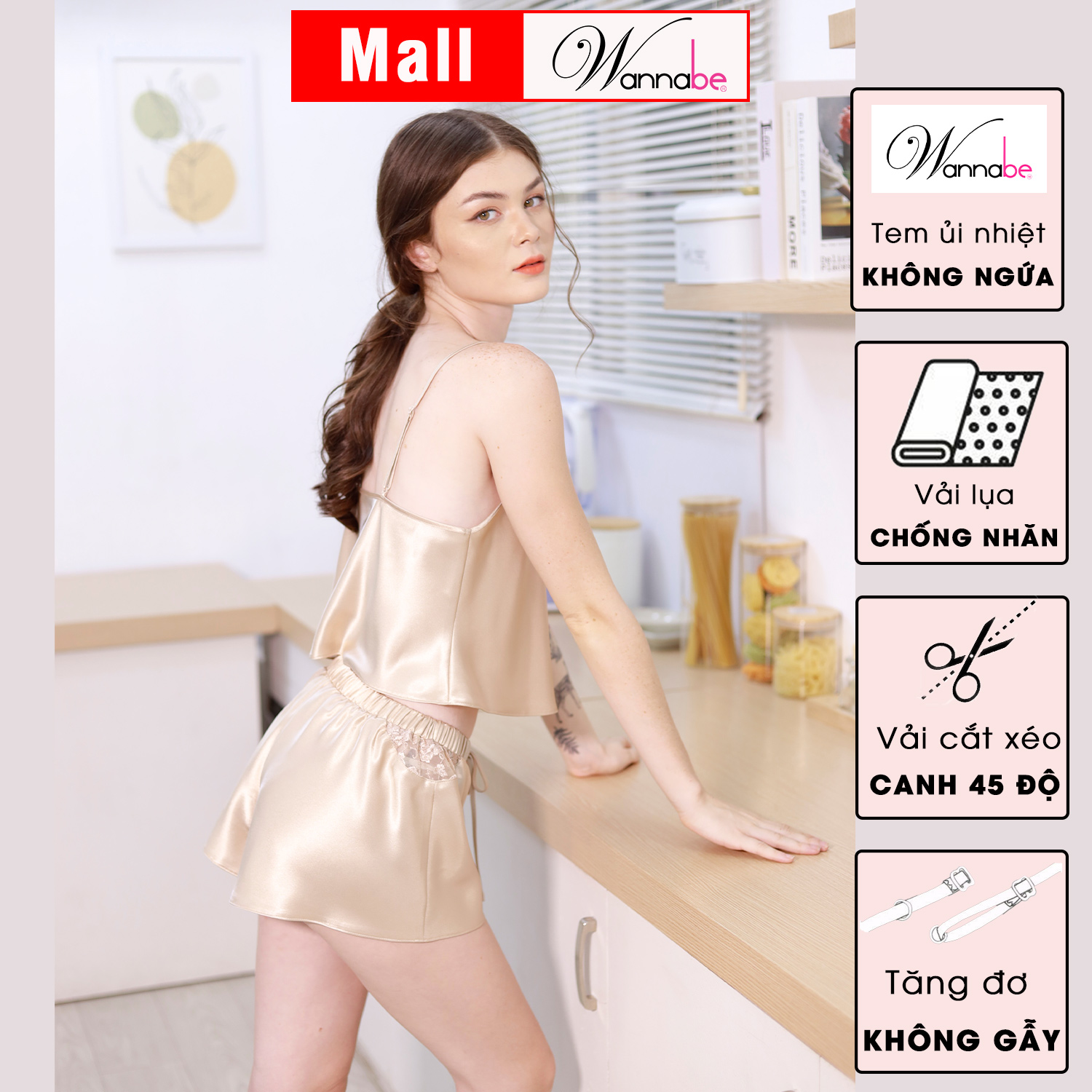 Đồ bộ mặc nhà lụa cao cấp WANNABE BSS62 thiết kế kiểu dáng áo crop-top hai dây cùng quần short ngắn phối ren hai bên lưng quần nữ tính xinh xắn trên chất liệu mềm mại cao cấp mang đến cảm giác thoải mái thư giãn cho phái nữ khi mặc ở nhà