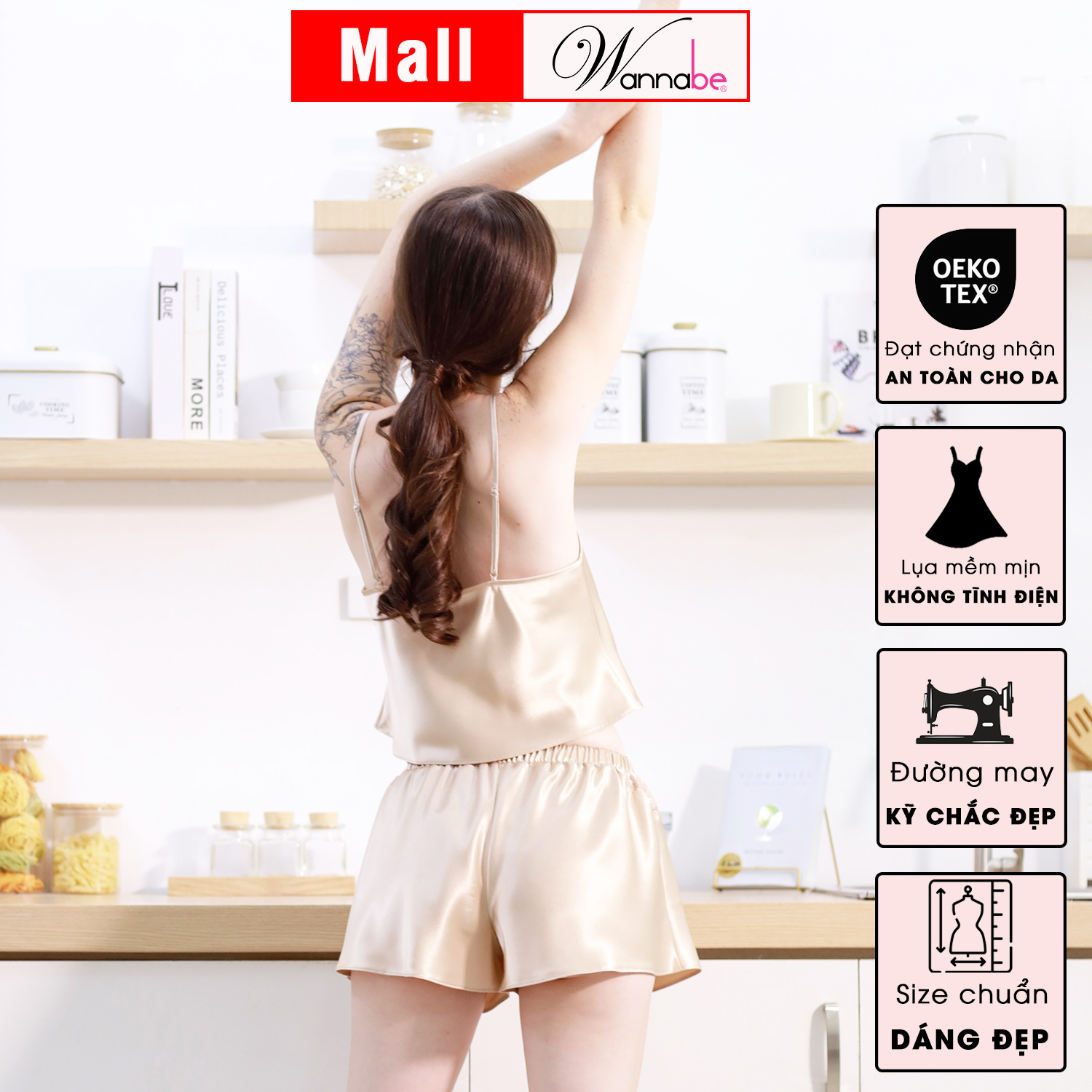 Đồ bộ mặc nhà lụa cao cấp WANNABE BSS62 đồ bộ quần sọt áo hai dây cổ áo phối ren thêu Nhật hình tam giác nhẹ nhàng