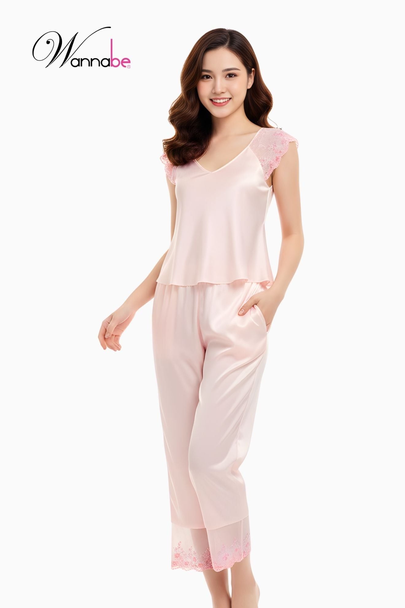 Đồ bộ mặc nhà Wannabe BDS06 thiết kế tay áo cánh tiên phối ren hoa nữ tính quý phái nhẹn nhàng, trên chất liệu satin lụa mềm mại mang đến cảm giác thoải mái dễ chịu cho phái nữ khi diện ở nhà