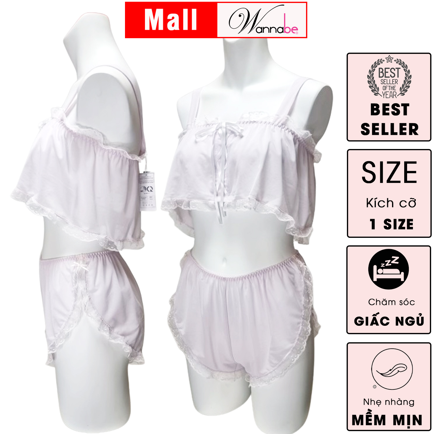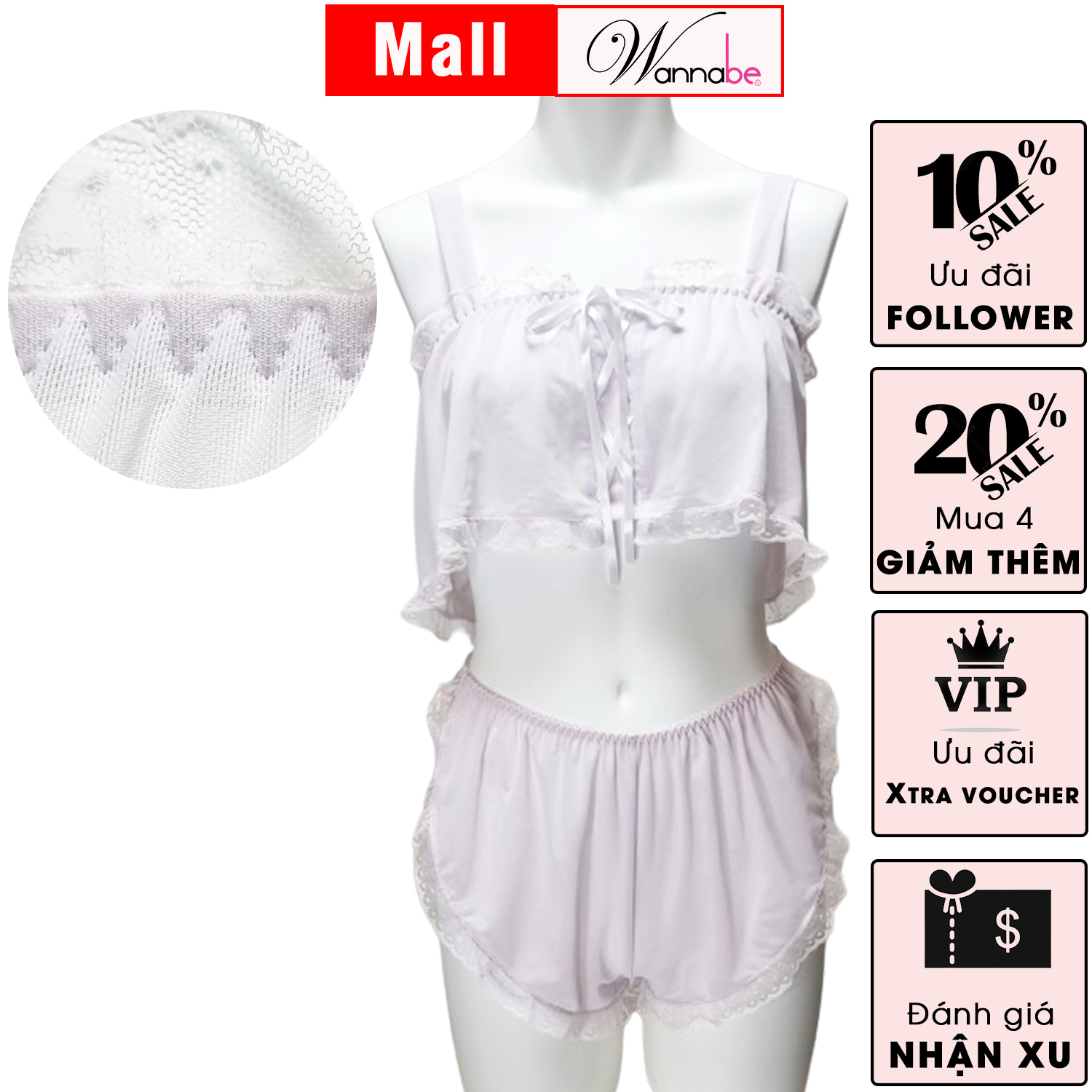 Đồ bộ mặc nhà Wannabe BSC05 thiết kế xinh xắn, đáng yêu, nữ tính nhưng cũng không kém phần quyến rũ, gợi cảm. Với áo được thiết kể kiểu dáng crop-top phối ren nhúm nhẹ nhàng phần cổ áo, lai áo cùng quần short trẻ trung viền ren sườn quần mang đến sự đáng yêu cho các bạn gái khi diện ở nhà