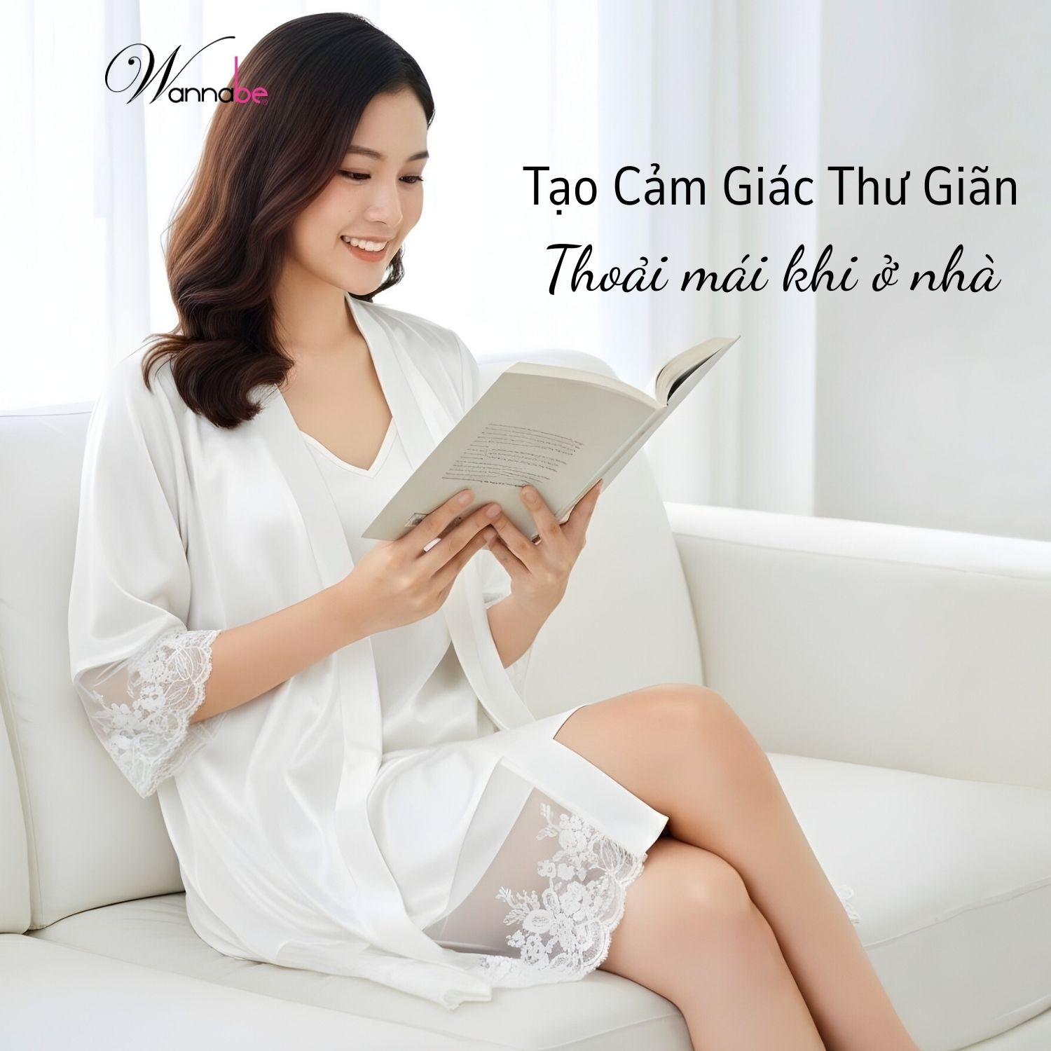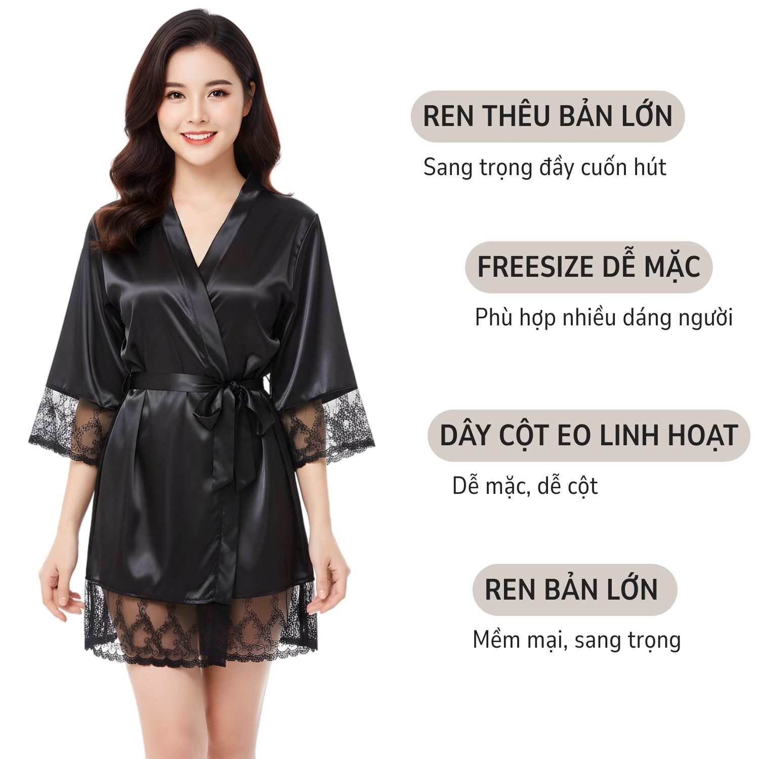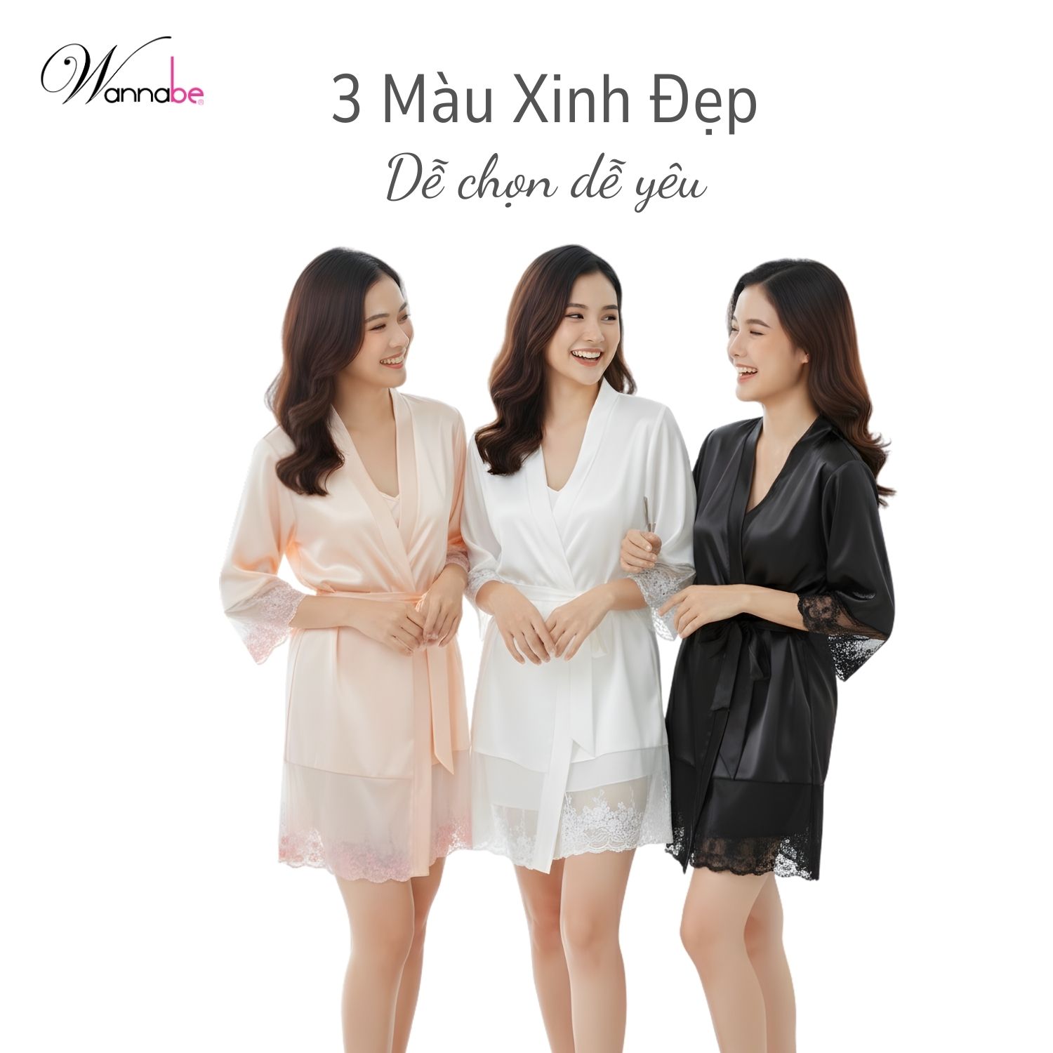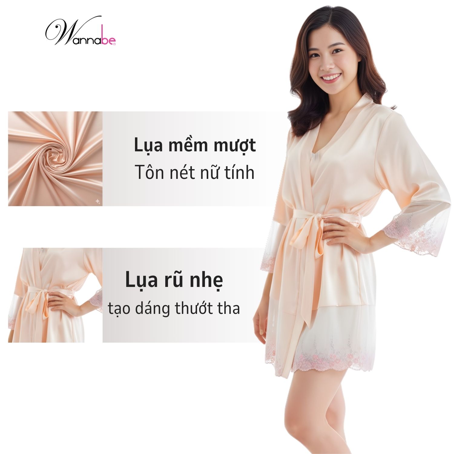 Áo choàng ngủ phi lụa WANNABE KIS06 áo khoác kimono lai áo, lai tay phối ren xinh xắn nữ tính sang trọng