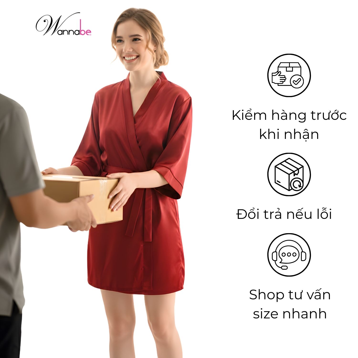 - Đổi áo choàng ngủ miễn phí nếu sản phẩm bị lỗi từ Wannabe (quý khách vui lòng quay video mở hàng để Wannabe hỗ trợ nhanh hơn)