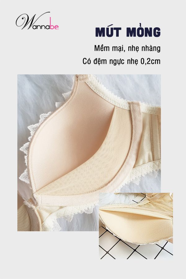 Mút ngực: Mút ngực Wannabe mỏng, có đệm ngực nhẹ 0.2cm, có lớp lót hỗ trợ nâng ngực