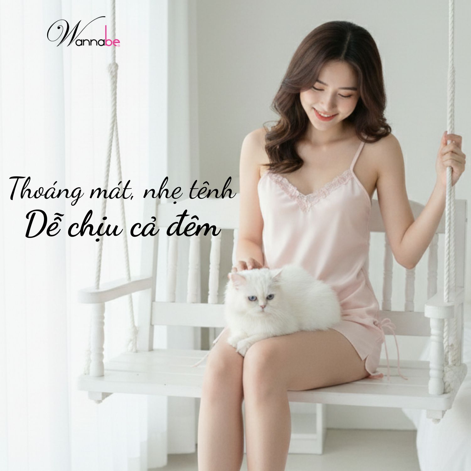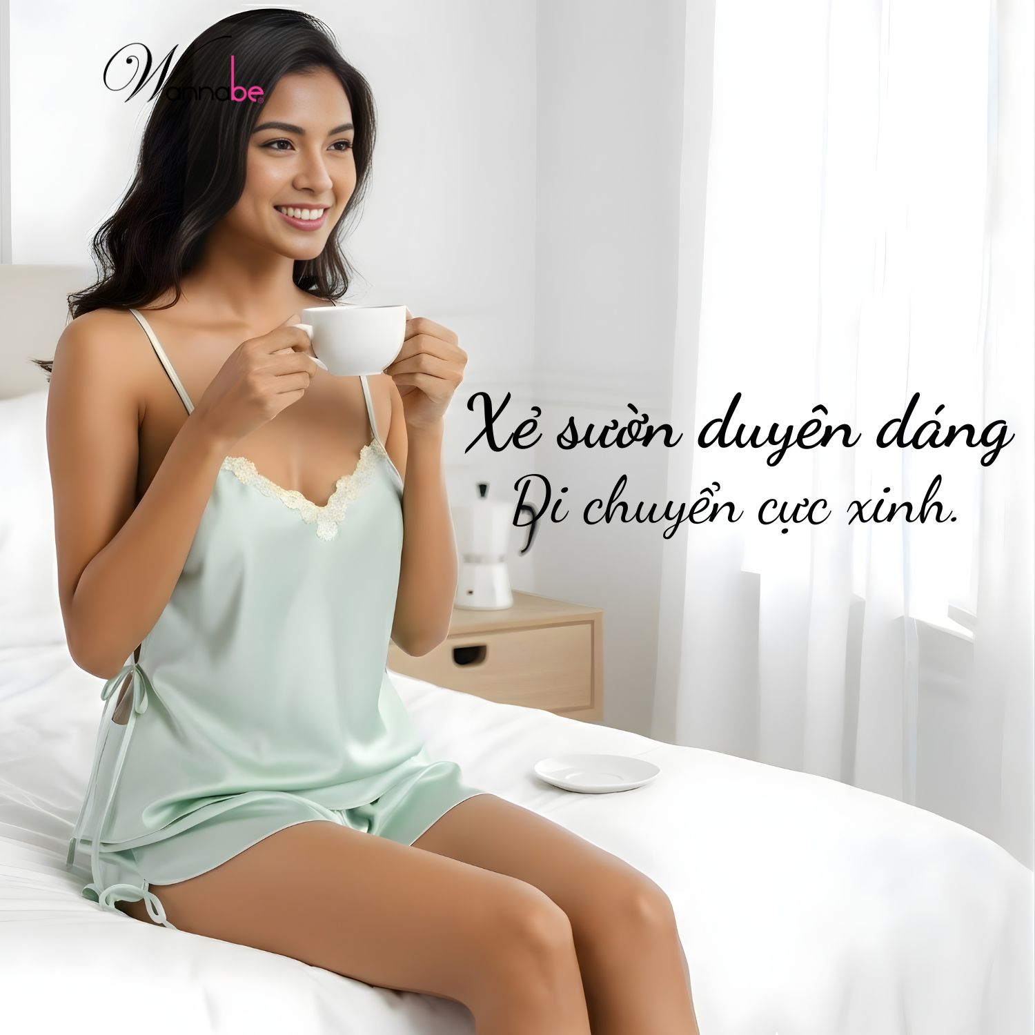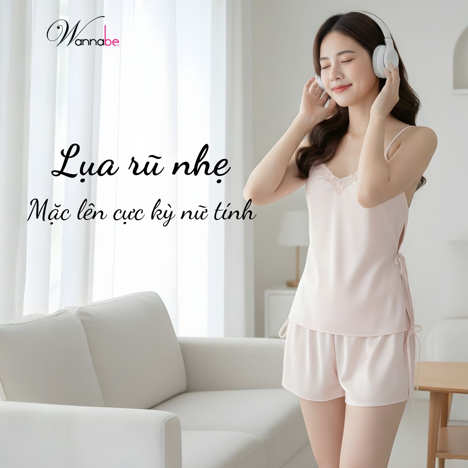 Đồ bộ Ngủ Nữ Lụa 2 Dây mịn phối ren hoa mát lạnh mùa hè WANNABE đồ bộ êm ái từng đường chạm BSL03