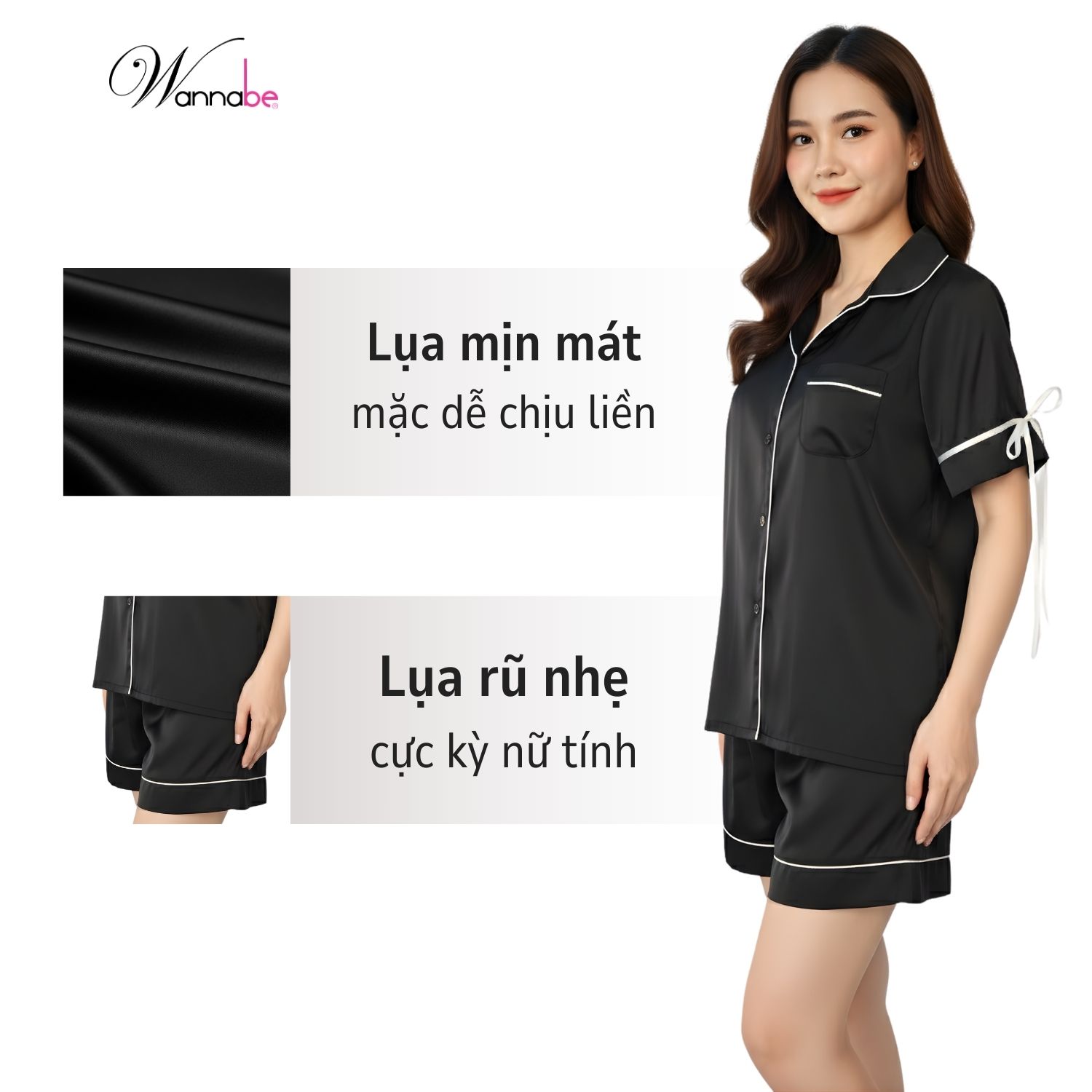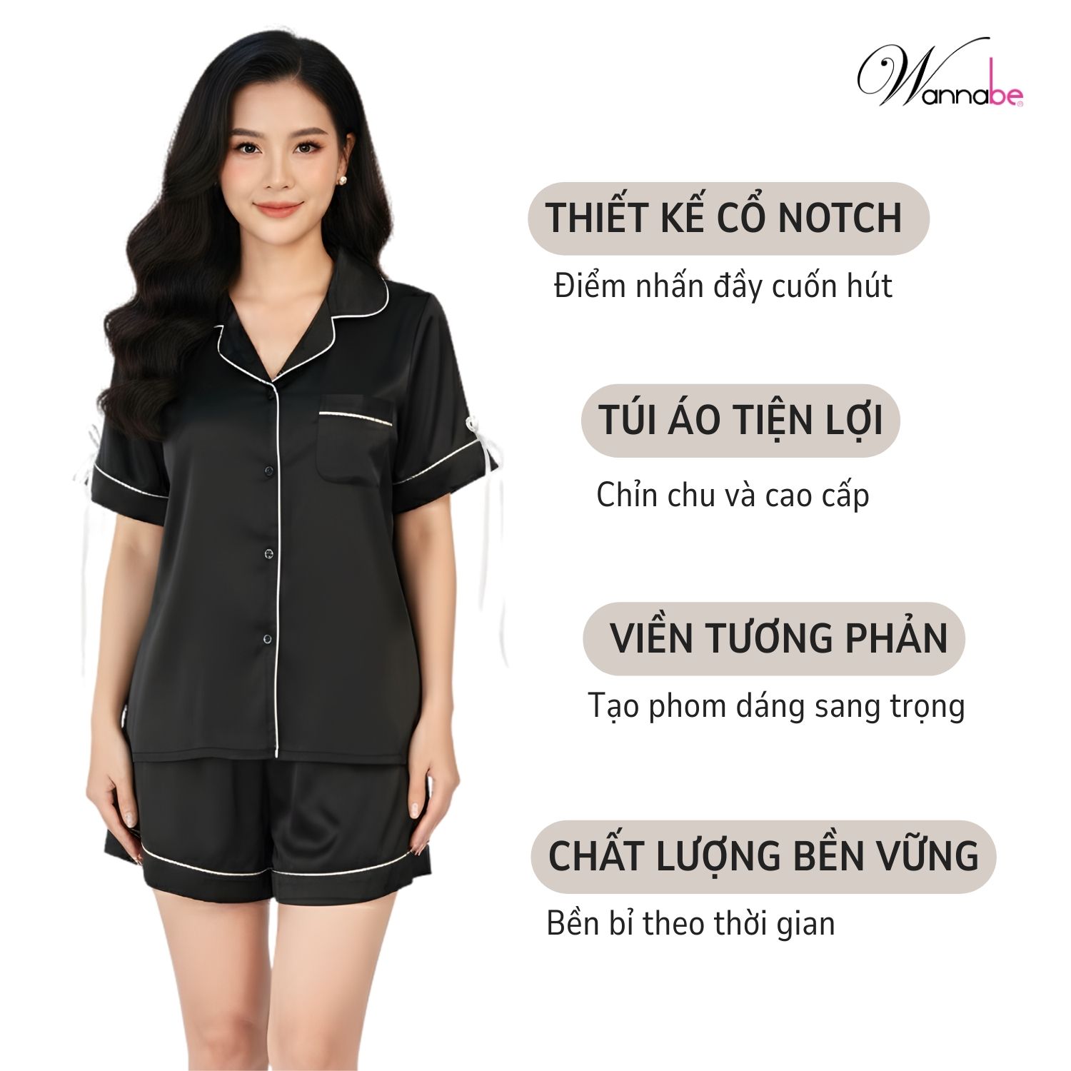Bộ pijama lụa latin cao cấp WANNABE đồ ngủ mặc nhà tay ngắn thắt nơ ống tay phong cách coquette