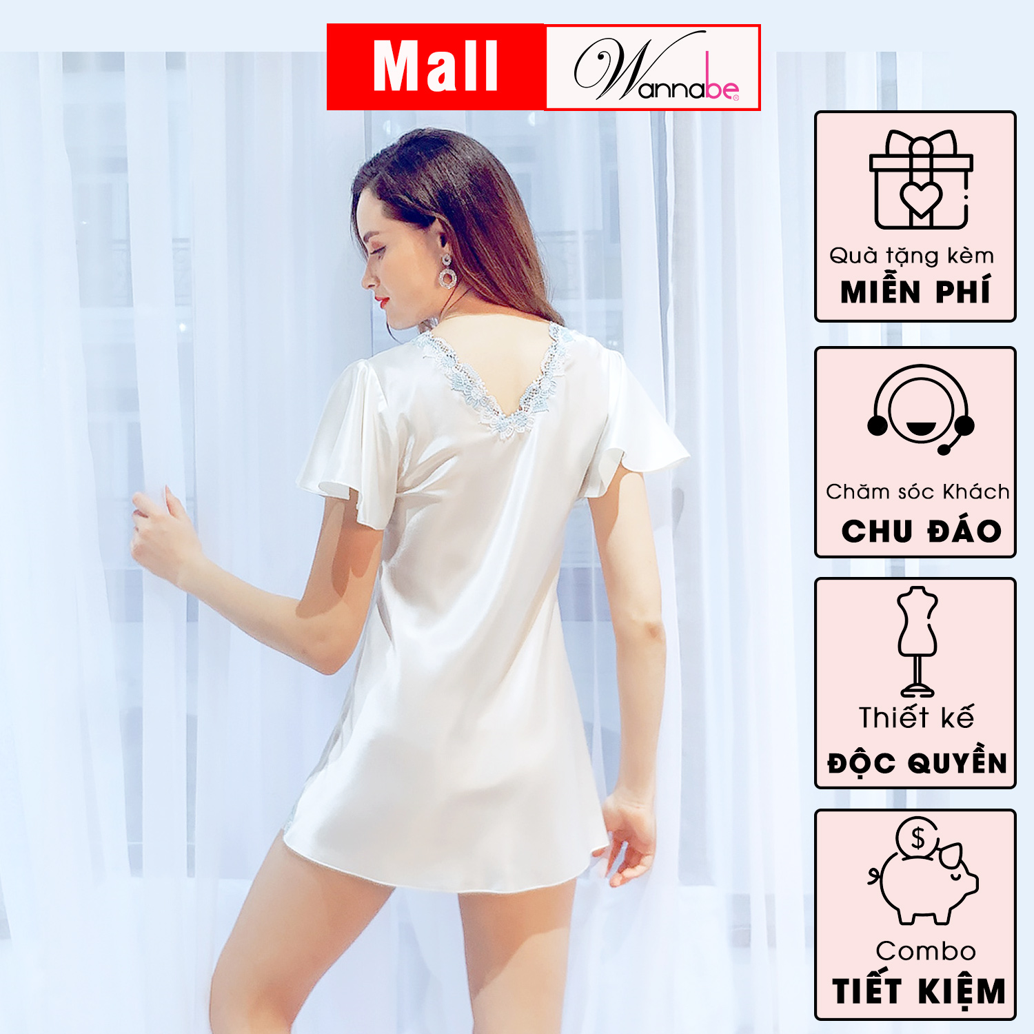 Đầm ngủ phi lụa cao cấp Wannabe DNS08 kiểu dáng váy chữ A, cổ tim xẻ cạn viền ren hoa vòng từ trước ra sau cùng với thiết kế tay áo cánh tiên xòe tròn, dợn đẹp rủ tự nhiên tôn lên vẻ đẹp quý phái nữ tính nhẹ nhàng của phái nữ khi diện mẫu đầm này