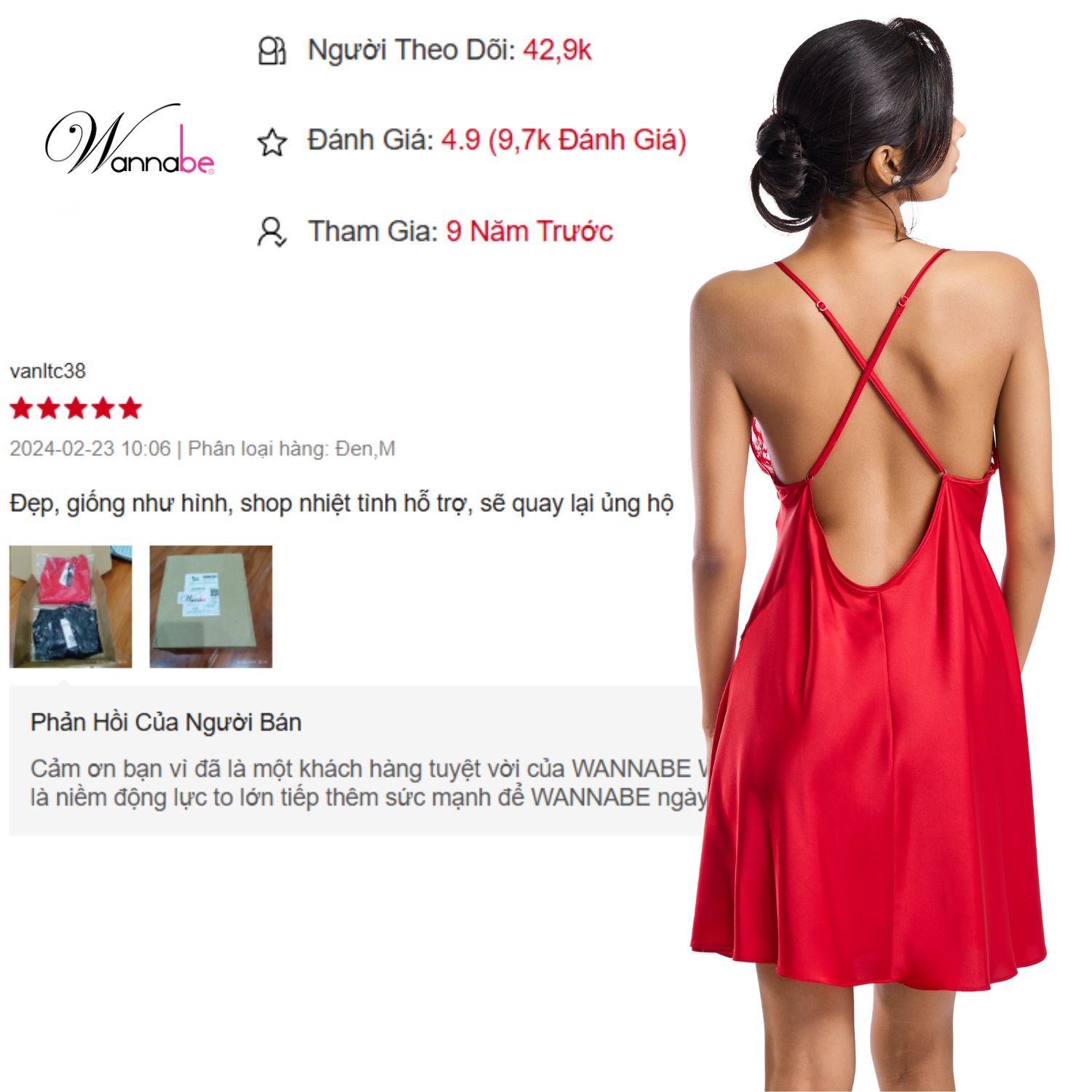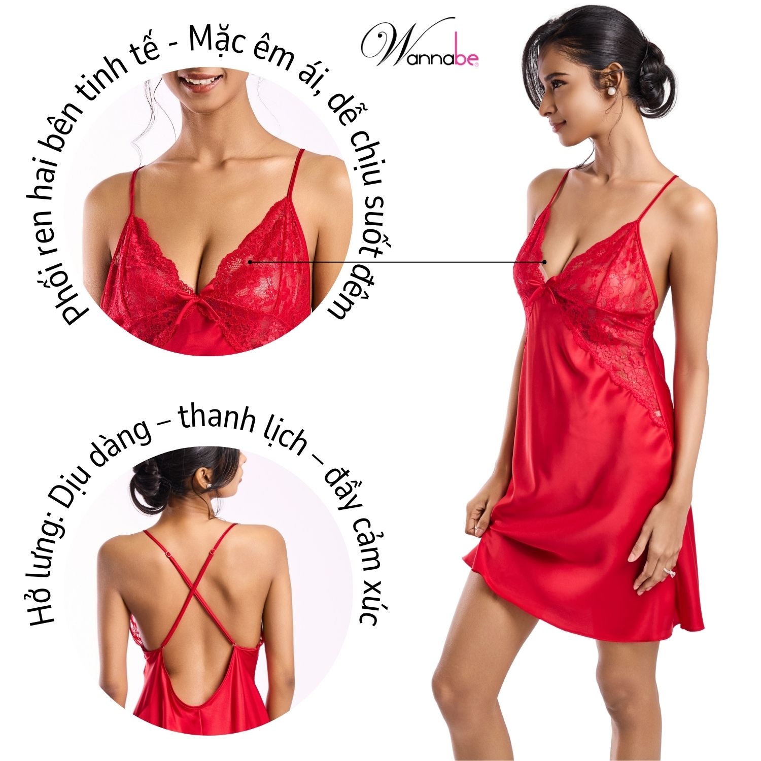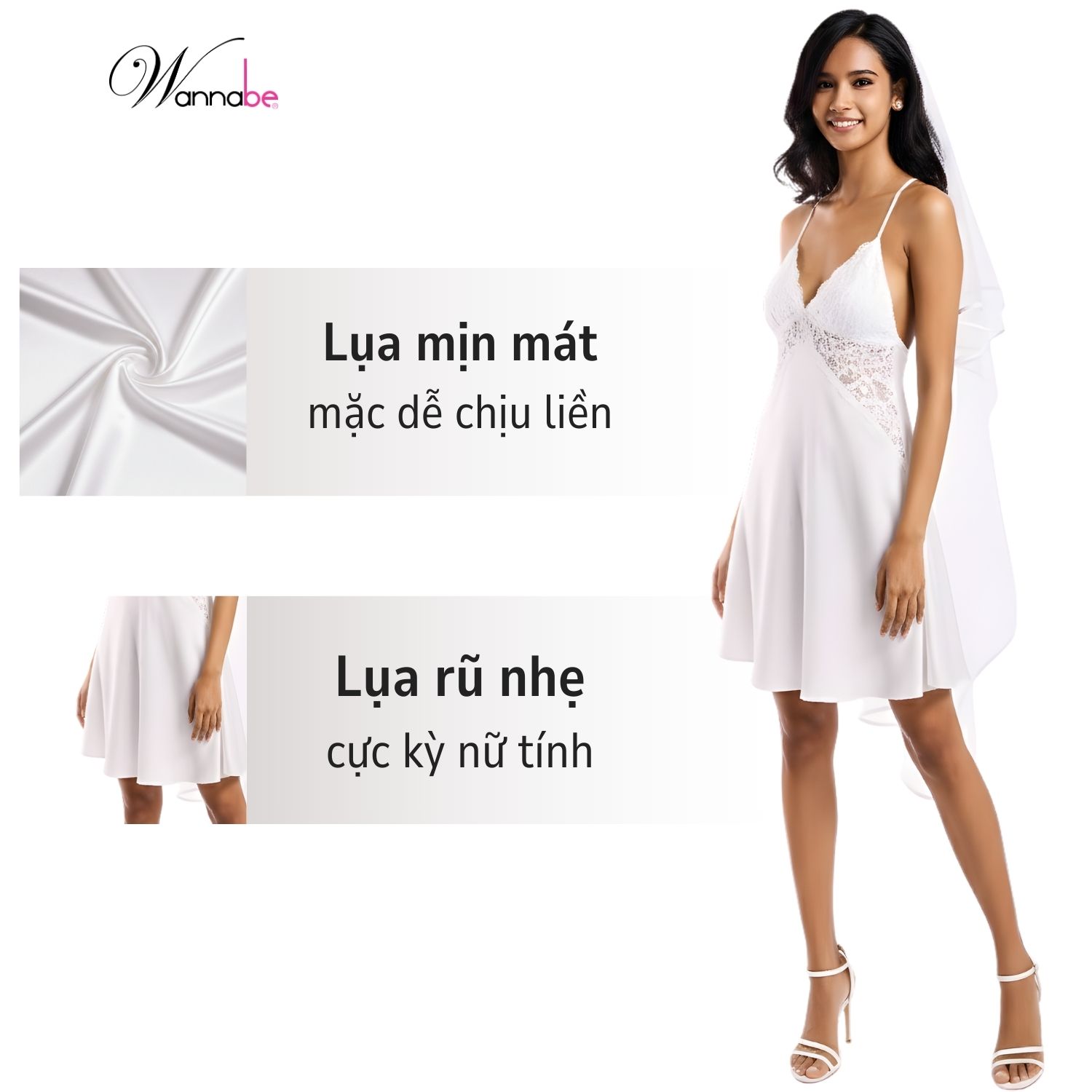 Váy ngủ lụa cô dâu phối ren cổ V sâu WANNABE đầm ngủ bridal cao cấp cho cô dâu đêm tân hôn DNR02