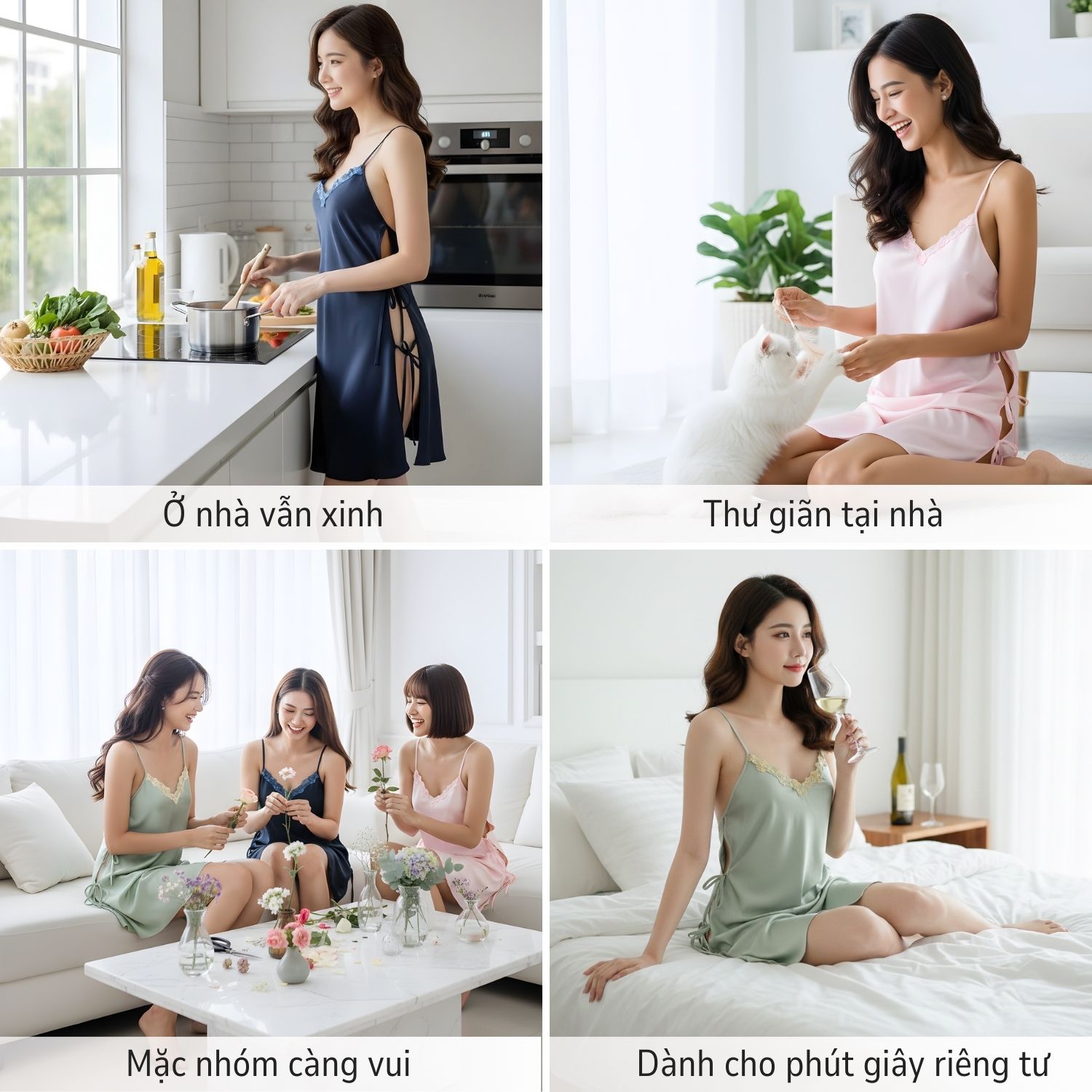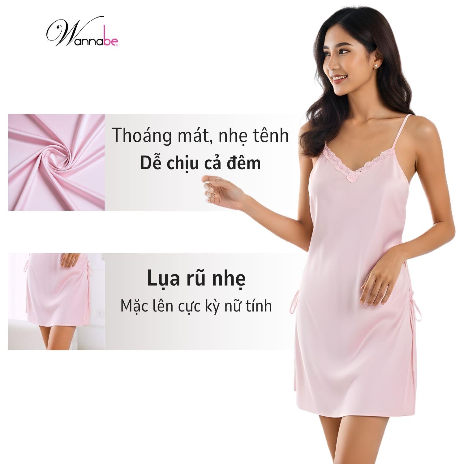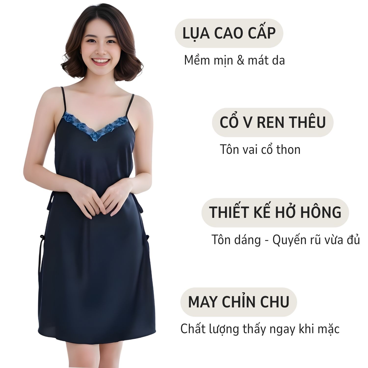 Bạn sẽ cảm nhận ngay được sự nâng niu, dịu dàng mỗi khi váy chạm vào da – giống như bạn đang khoác lên mình một làn hơi thở dịu dàng của đêm.
